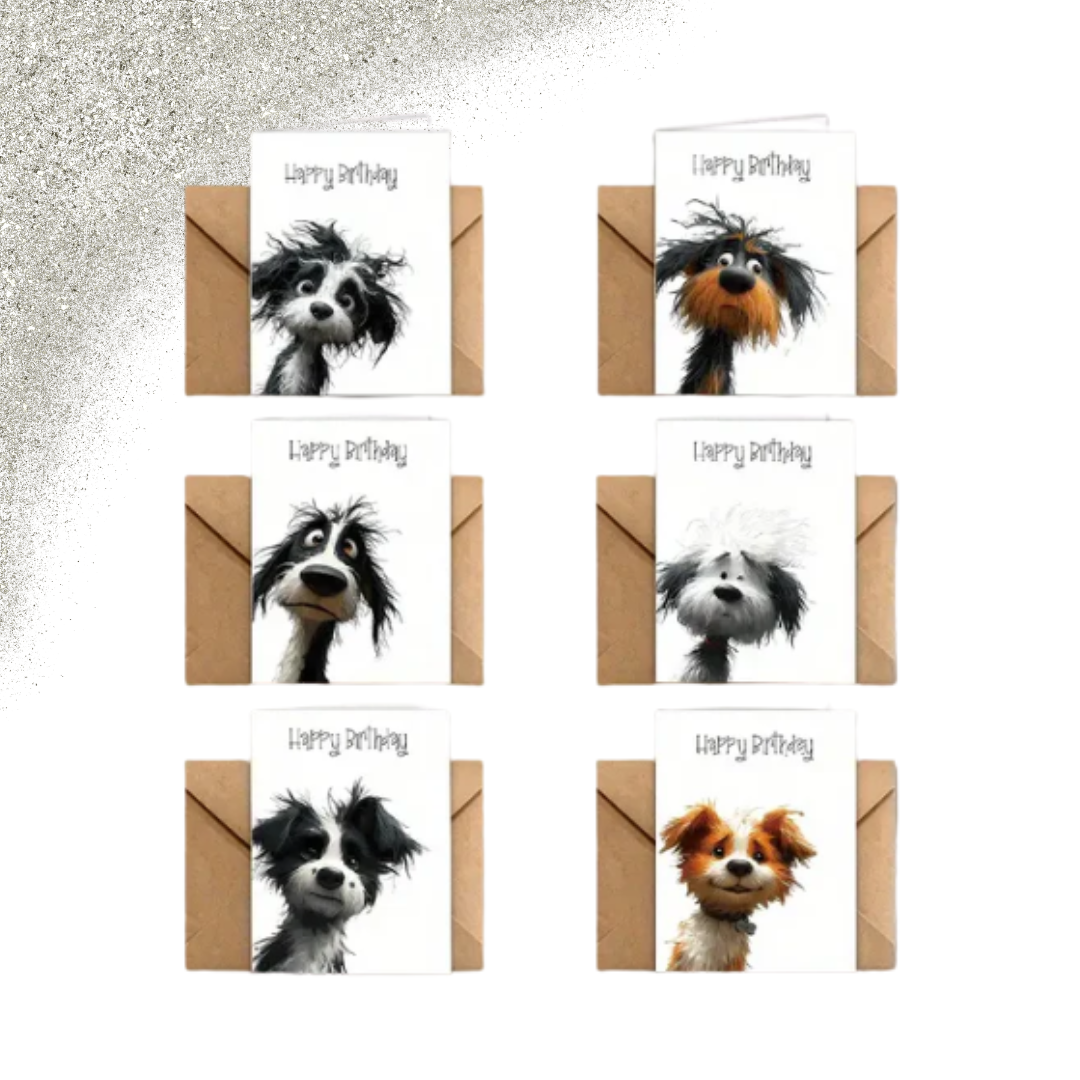 Verras je vrienden of familie met een glimlach dankzij deze unieke set verjaardagskaarten met grappige hondenkoppen in de hoofdrol. Perfect om altijd een kaart in huis te hebben voor een verjaardag. Inclusief bijpassende enveloppen.