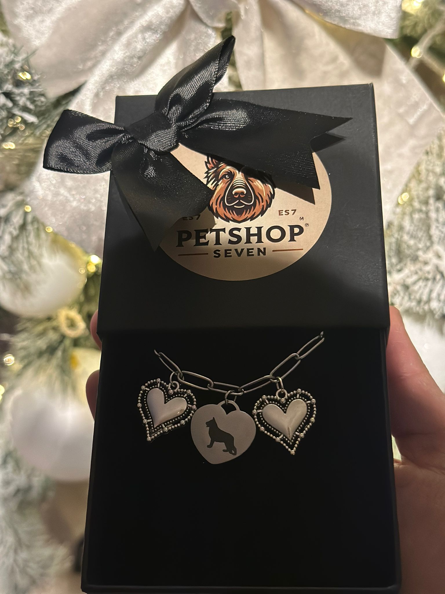 Onze exclusieve armband met hondensilhouet en harten is speciaal ontworpen voor échte hondenliefhebbers. De hartjes staan symbool voor liefde en verbondenheid, waarbij het middelste hart het silhouet van jouw hond draagt — een prachtige, subtiele manier om jouw trouwe maatje altijd dichtbij je te hebben. Elke gravure wordt zorgvuldig aangebracht voor een strak en herkenbaar silhouette. De armband heeft een luxe uitstraling en past perfect bij elke outfit. Of je het nu draagt als dagelijks aandenken, als mode-accessoire of als symbolisch sieraad, het voelt altijd speciaal.