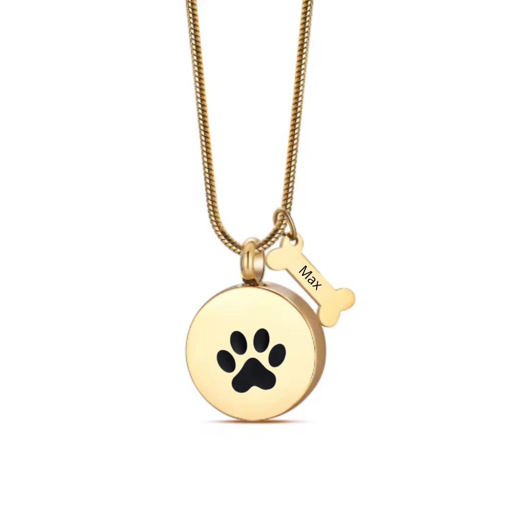 Deze prachtige ronde ashanger met pootafdruk staat symbool staat voor de onvoorwaardelijke liefde en vriendschap van je hond. De ashanger is goudkleurig en heeft een klein hondenbotje bedeltje. Hierop graveren wij de naam van uw trouwe viervoeter.