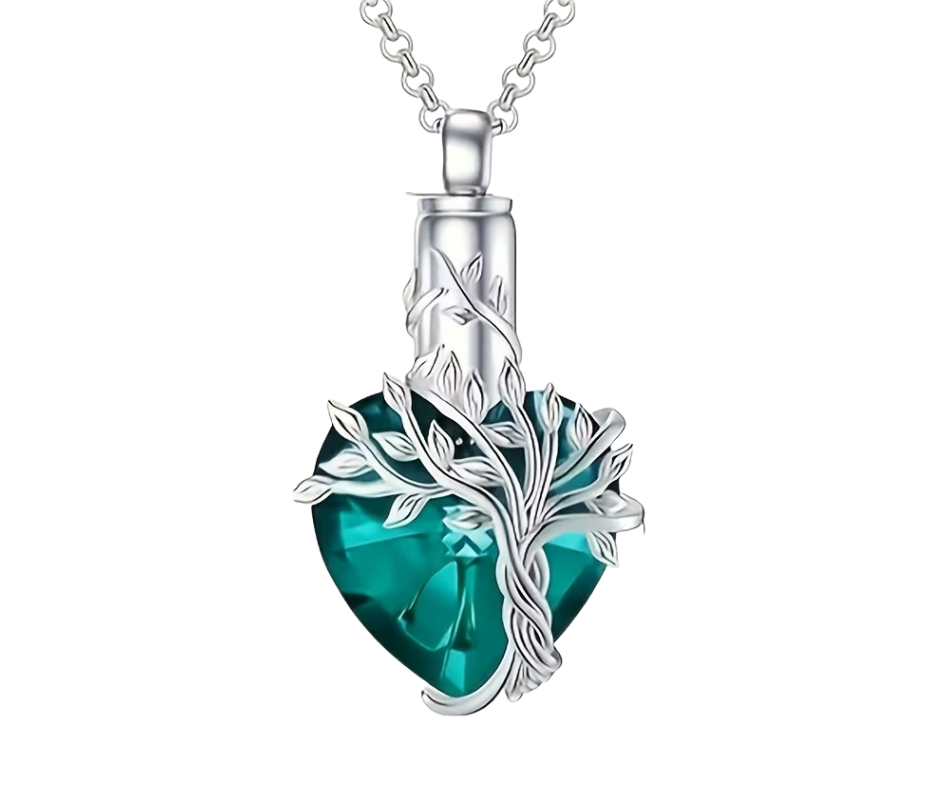 Draag de herinnering aan je dierbare altijd dichtbij met deze prachtige hartvormige ashanger met Levensboomontwerp en een fonkelende groene steen, wat staat voor kracht, verbondenheid en eeuwige liefde. Dit sierlijke gedenksieraad is ontworpen om een klein beetje as of een ander symbolische herinnering veilig en dichtbij te bewaren.