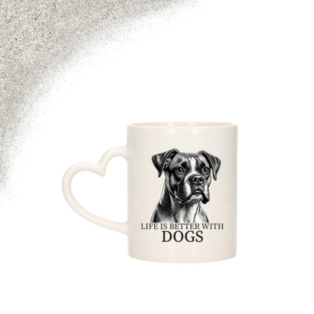 Ben jij zelf een trotse hondenmoeder of ken je er één? Dan is dit het leukste cadeau om te geven! Wij zetten de kop van uw huisdier om in een zwart wit tekening en bedrukken de afbeelding op deze schitterende beker met hartvormige handvat. Onder de afbeelding komt de tekst: Life is better with dogs.