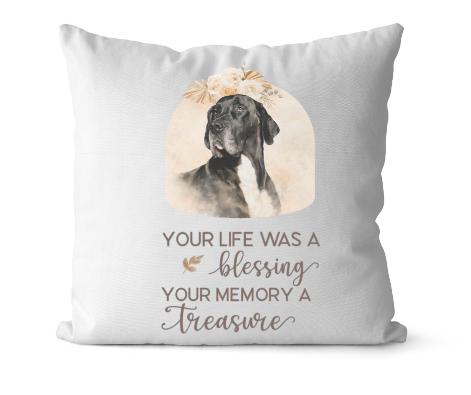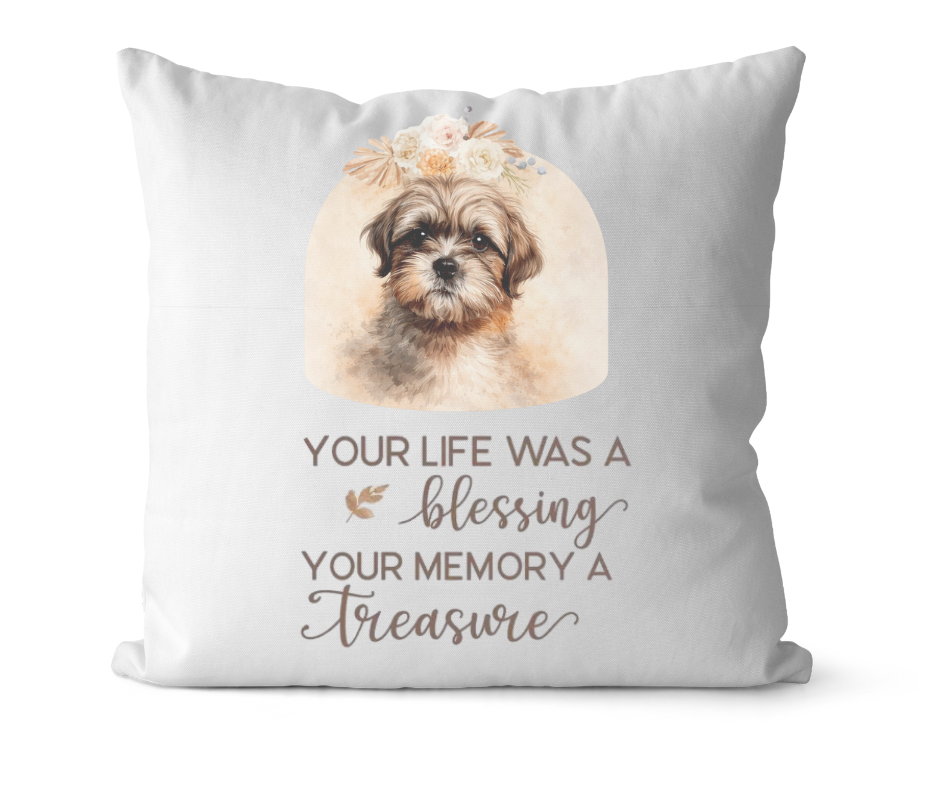 Dit schitterende kussen biedt troost na het verlies van je hond en is tevens blijvende herinnering en een tastbaar aandenken aan je trouwe viervoeter. Het kussen wordt in een zachte illustratie bedrukt met een afbeelding van jouw hond. De ronde vorm en subtiele bloemen geeft het ontwerp een warme en liefdevolle uitstraling.