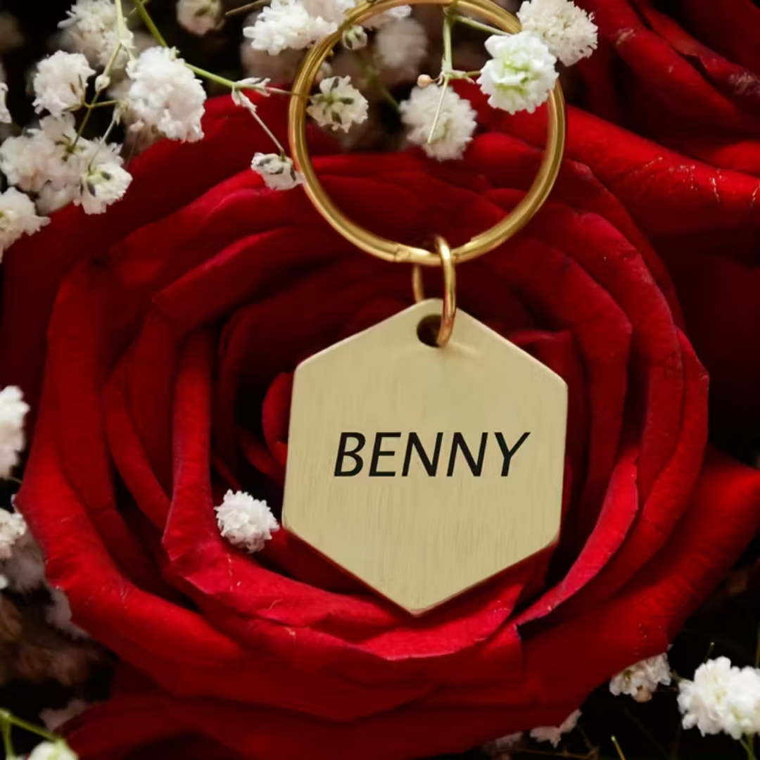 Zorg dat uw huisdier altijd direct te identificeren is met deze zeshoekige gouden hondenpenning. De penning is bestand tegen roest en verkleuringen en daarnaast een schitterende eyecatcher aan de halsband van uw hond. Aan de hondenpenning is een lief bedeltje van een klein hondenpootje bevestigd.
