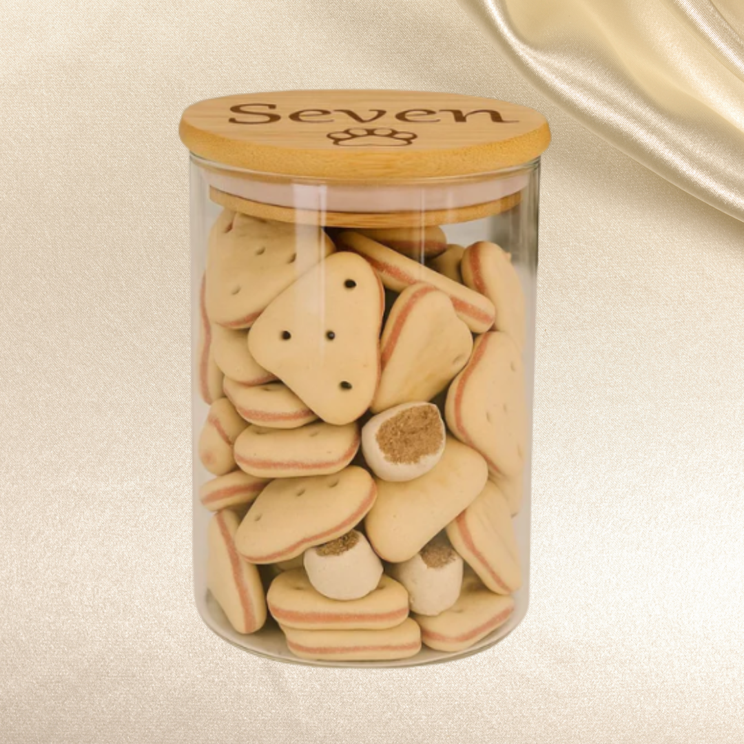 Bewaar de favoriete snacks van jouw hond in zijn eigen glazen hondensnoeppot met zijn naam! De stevige pot heeft een luxe bamboe deksel waarin wij de naam van jouw trouwe viervoeter professioneel graveren. Maak van ieder snackmoment iets speciaals en bestel vandaag nog jouw gepersonaliseerde hondensnoeppot.
